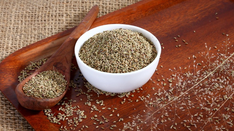 Ajwain, also known as carom seeds, is a spice that is popular in Indian cooking, though it is largely unknown throughout the U.S. Coming from a seed-like fruit, ajwain is extremely fragrant. Although it smells like thyme, its flavor profile lies somewhere between oregano and anise, with notes of mint and cumin. It is relatively bitter. Because its flavor is very strong, you don't need much to imbue your cooking with its unique flavor. It is a relative of cumin, fennel, and coriander, and has origins in Iran and modern-day Türkiye. Like many of the herbs and spices in this list, the use of ajwain dates back hundreds of years, when it was common both as a medicinal spice and in cooking in Africa, India, and the Middle East.