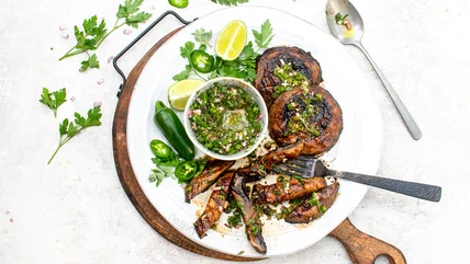 Grilling soy sauce–marinated portobellos makes for a hearty, savory treat that's only further elevated by a homemade jalapeño chimichurri dipping sauce.