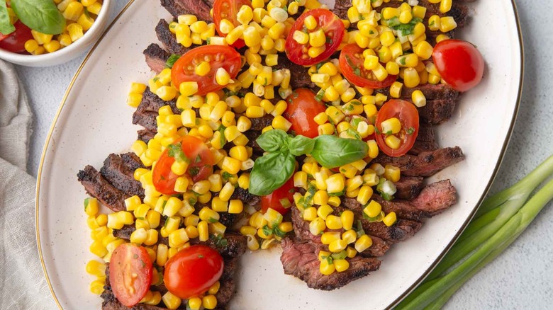 - Place the sliced steak on a serving platter and top with the corn salsa. Serve immediately.