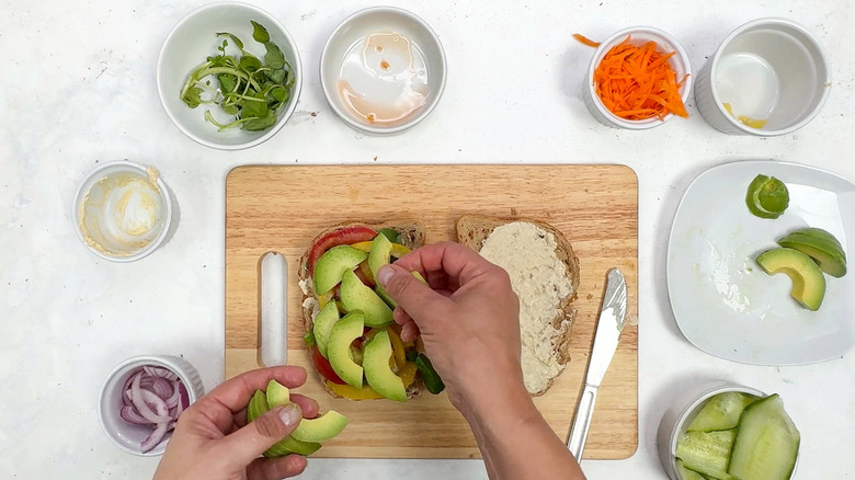 For many people, there are few things in life more satisfying than a well-constructed sandwich. All of your favorite ingredients — meat, cheese, veggies, condiments, and special sauces — piled together between 2 slices of good bread. If you're a vegetarian, trying to incorporate more veggies in your life, or looking for a meat-free Monday option, you might be getting a little tired of cheese sandwiches. Plus, cheese is all very well if you're lacto-vegetarian, but won't do you much good if you're vegan, and let's face it, vegan cheese isn't everyone's cup of tea. You know what makes a better plant-based protein source for a homemade veggie sandwich? Hummus, which is what developer Annabelle Randles uses in this recipe.