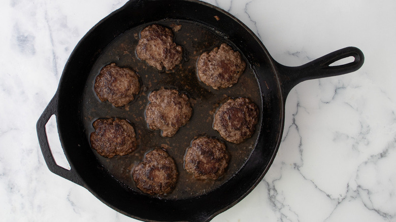 The burgers are made with ground beef seasoned with salt and pepper, while you'll need butter, a yellow onion, bacon, and American cheese to top them as well as slider rolls to keep everything together. As for the ranch dressing, that's made from mayonnaise, sour cream, dill pickle juice, garlic powder, onion powder, and dried parsley.