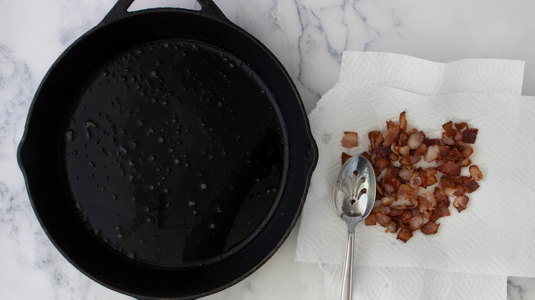 - Using a slotted spoon, remove the bacon from the skillet, and set aside on a paper towel-lined plate.