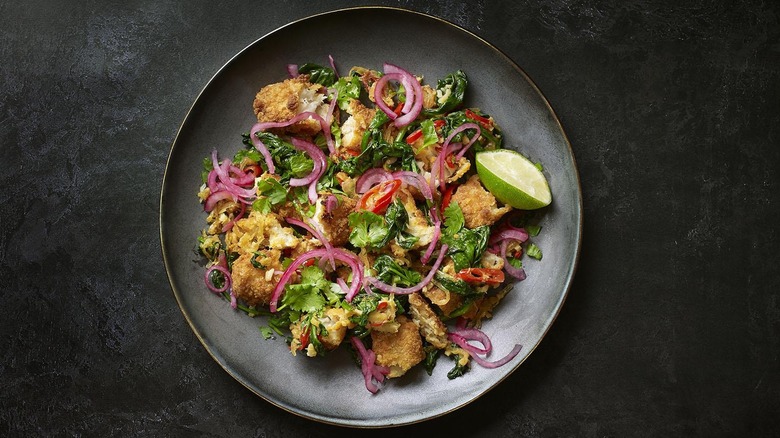 Adding fish sticks into a salad is a great way to upgrade your freezer find. Because, despite all the things we love about fish sticks, there is a little elephant in the room when it comes to the health part of things. Yes, they are a great source of protein and omega-3 fatty acids, but they can also pack a hefty dose of saturated fats and sodium, which might mean you want to think twice before eating them. Of course, when served with fries and a high sugar, processed sauce, your plate isn't going to win any health awards. So, upgrade your fish sticks by serving them in a nutrient packed, fresh salad and suddenly indulging in a fish stick meal isn't looking too bad.