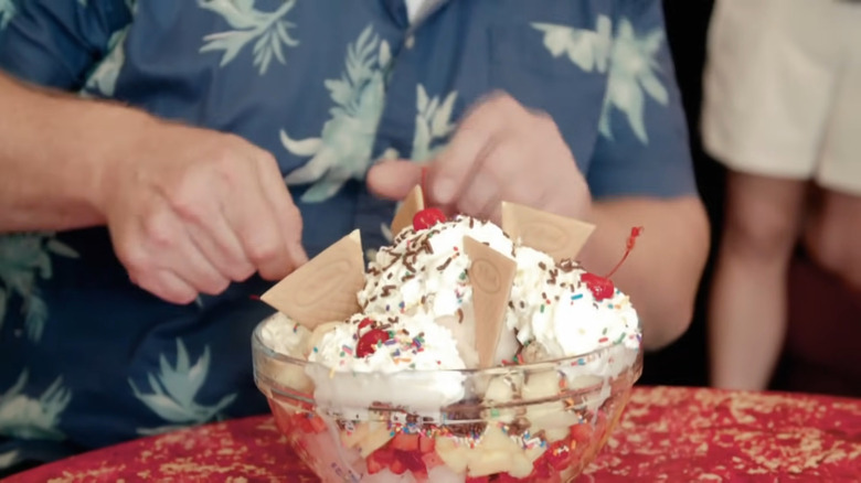 In addition to the eight scoops of ice cream, which Webb was able to hand pick flavors himself, the sundae was loaded with toppings. Webb chose six servings of fruit plus two servings of chocolate sprinkles. In addition to a mandatory eight servings of toppings, the Tchoupitoulas sundae comes with a mountain of whipped cream, rainbow sprinkles, cherries, and triangle wafers.