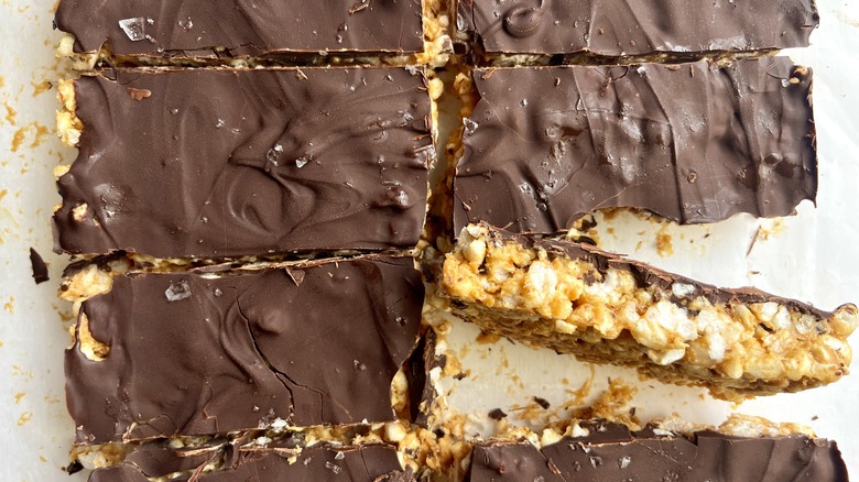 Rice cakes were a childhood favorite of recipe developer Tess Le Moing. She tells us, "They are such a nostalgic snack for me. I remember eating them a lot as a kid so I thought it would be fun to add them to this adult-ish recipe." Recalling how light and crisp they are, she chose them as the base for her easy peanut butter chocolate crunch bars, "Rice cakes are literally the foundation of this recipe. They have a light, soft, and airy texture which makes it easy to have more than one of these bars."