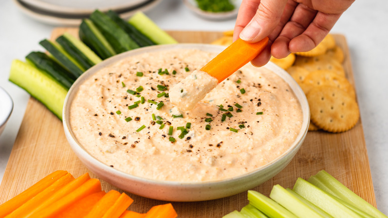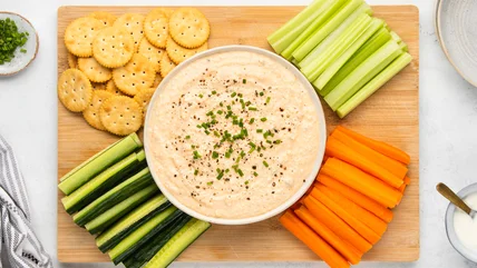 There are plenty of ways to enjoy this delicious dip. While crackers and crudites like sliced carrot, cucumber, and celery are a classic choice, you can always branch out and widen your spread of dunking options. Generally, anything crunchy and easy to eat with your hands will work well.