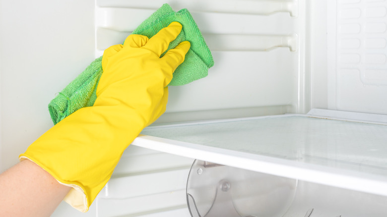 You can use the same combination of a soft cloth soaked in hot water and dish soap to clean the surfaces. Meanwhile, the best way to clean the removable pieces like shelves and drawers is to throw them in the dishwasher — though you'll want to confirm in the owner's manual that these parts are dishwasher-safe before you do so. Not only will this be easier than hand-washing every individual piece, but it will also give you the perfect opportunity to clean out debris from the drawer tracks to help prevent sticking. Once the interior of your refrigerator is sparkling like new, you can put a few drops of vanilla extract on a cotton ball and place it in the back of the appliance to make it smell as good as it looks.