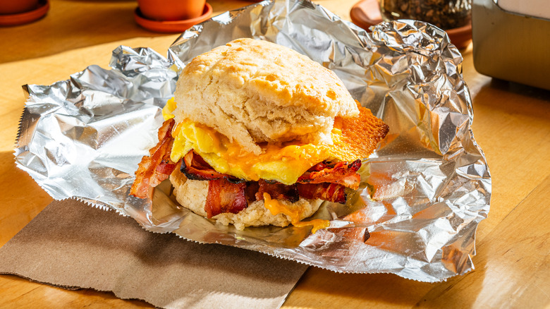 What's better than a pan of cheesy scrambled eggs and bacon? Cheesy scrambled eggs and bacon stuffed inside a sandwich, of course. In January 2024, Dunkin' reported that it would be testing out a few new menu items in select New England locations. One of these was the Brioche Scramble Breakfast Sandwich, which — as its name suggested — consisted of a mass of cheesy scrambled eggs and bacon topped with chipotle aioli sauce inside a soft, brioche bun. We don't know about you, but this sounds like a pretty heavenly breakfast select alongside any of Dunkin's celebrated cold or hot brews alike.