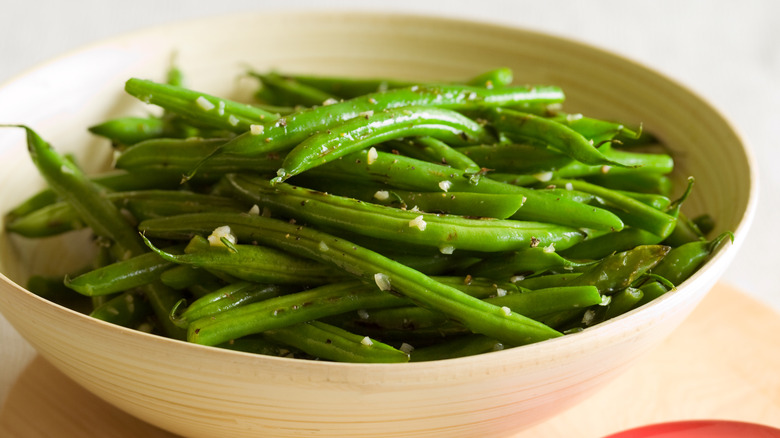 If your green beans are fresh, they should have a lot of great flavor already, according to Kathy Berget, so you will want to keep the seasonings simple. Fresh garlic, herbs, and nuts are some popular seasoning additions to play up the green beans' natural flavors. "Green beans are great with any kind of seasonings, but I would stay away from items with high acidity like lemon juice or vinegar — this will turn the beans' color to (an) unappetizing shade of green," said Shawn Matijevich.