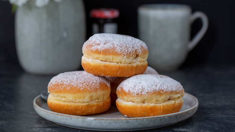 What makes a Berliner different is that it's enriched with milk, butter, and eggs — plus an extra egg yolk, so the dough is richly flavorful. The jelly inside isn't your standard strawberry, either. Currant and rosehip jelly are both traditional options. These doughnuts can also be filled with vanilla custard or chocolate mousse — great news if you don't like jelly.