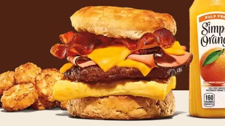 When it comes to the meat portion of Burger King breakfast sandwiches, customers typically have to choose between bacon, sausage patties, or ham. But then someone had a genius idea: why not combine all three breakfast meats into one sandwich? And thus, the Bacon, Sausage, & Ham Fully Loaded Biscuit was born. A towering breakfast sandwich with eggs and cheese, nestled between a sliced biscuit, it's kind of shocking that this monster is somehow only 647 calories, at least according to Burger King.