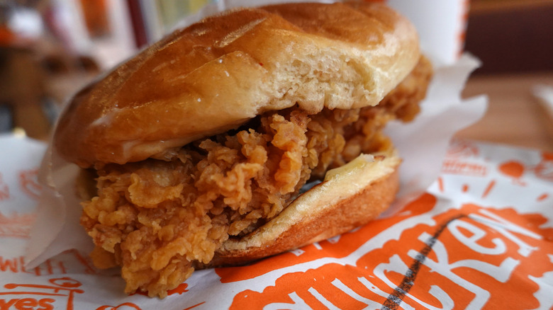 McDonald's is a juggernaut in the world of fast food, and it's no surprise that it would be a contender in the spicy chicken sandwich wars. The Spicy McCrispy and McCrispy hit menus in 2021 and quickly became a fan favorite, landing the sandwich on many McDonald's menu rankings in its relatively short existence. The sandwich consists of a crispy chicken filet placed on a shiny potato bun each with a generous helping of the spicy pepper sauce, finished off with crispy pickles for balance.