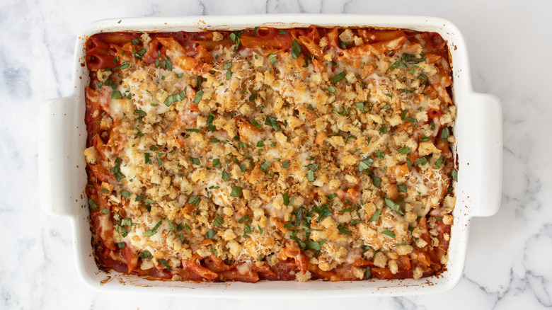 The base of the casserole consists of penne pasta, marinara sauce from a jar, and frozen popcorn chicken covered in mozzarella and Parmesan cheeses. You'll also need chicken broth and garlic as well as Italian bread, Italian seasoning, and butter for the crunchy crumb topping and parsley and basil to use as a garnish.