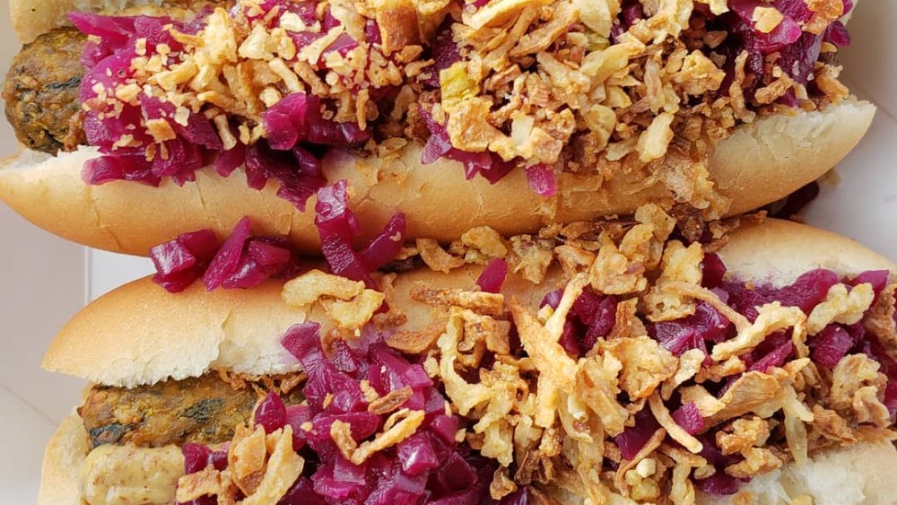 Long gone is the world of boring mustard and ketchup. Sure, that's classic and delicious in its own right, but don't you want to up your hot dog game? Well, even though the dog itself is delicious and packed with flavor, IKEA wanted their veggie offering to be even more spectacular. That's where the toppings come in. The IKEA veggie hot dog is topped with pickled red cabbage, spicy mustard, and fried onions. If you're not vegan and want to add another layer of flavor, you can get nacho cheese added as well.