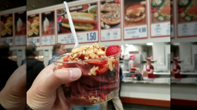 For a few years, they seemed to be featured on every restaurant menu and in every online blog's recipe bank: acai bowls. Açaí are small purple berries native to South America recognized for their numerous health benefits, and bowls made from a base of these blended little super fruits, along with add-ins like bananas, nuts, seeds, milk, and others, were a culinary trend in the early-to-mid 2000s. And while the Costco food court — with its $1.50 hot dogs, sodas, and greasy pizza slices — doesn't exactly present like the place you stop when you have a healthy meal on your mind, the wholesaler experimented with açaí bowls for a time, along with the rest of the world.