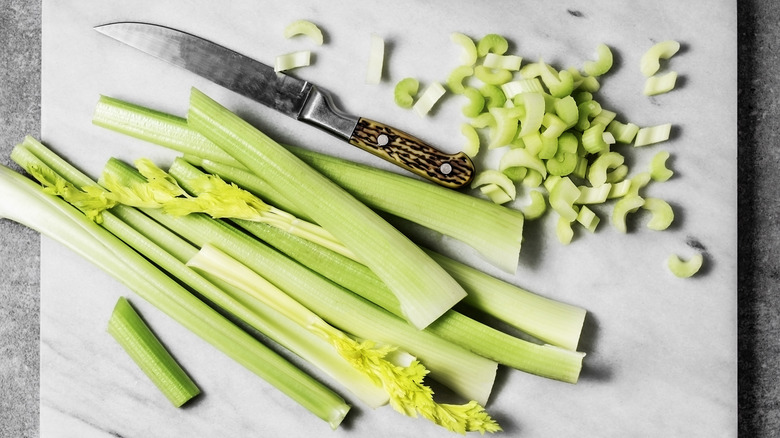 Because it grows straight from the soil, you should always wash your celery before eating it. Confirming what you likely already know, the USDA advises against adding soap to your produce washing mix. So, the good old water scrub should satisfy all cleanliness concerns. Peeling after washing can be an extra pesticide-reducing measure in some cases, but this would be comically challenging with celery. Instead, soaking the stalks in water with a splash of white vinegar for a few minutes is a common solution for the extra-cautious.
