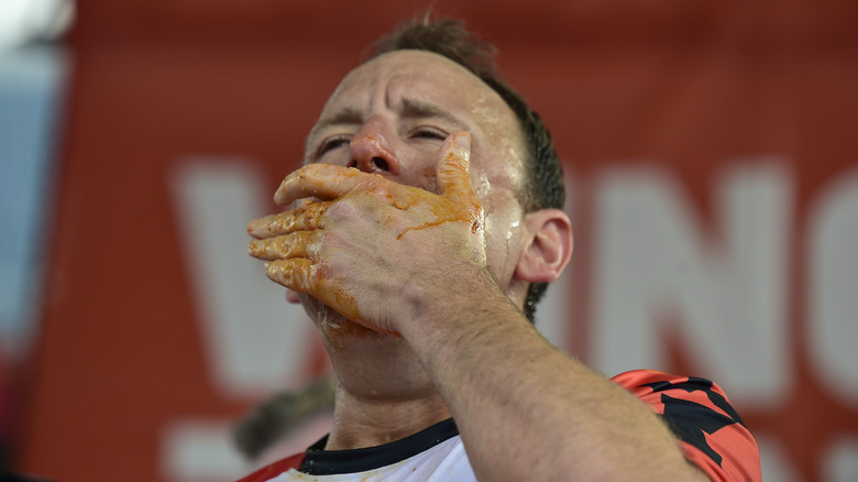 It's perhaps no surprise that speed-eating can cause discomfort. Even for the average person, gobbling down a meal too quickly can lead to indigestion, which includes unpleasant symptoms like abdominal pain, gas, nausea, heartburn, and bloating. As a professional speed-eater, Adam Moran is likely used to this discomfort. However, that doesn't mean he doesn't have trouble with this now and again.