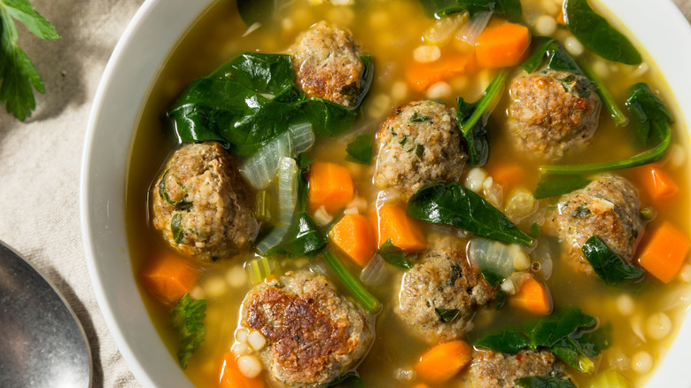 Expand your horizons beyond wedding soup and swap frozen meatballs into other recipes like classic Mexican meatball soup. The general prep is the same as for wedding soup — sauté all of the veggies before adding the frozen meatballs, broth, and other ingredients. Once the meatballs are added, mix in your broth and let everything simmer to blend the flavors.