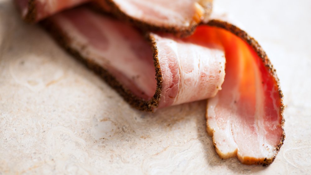 It's not just the type of curing that affects how bacon turns out, however. In fact, there are lots of different types of bacon, which vary depending on the cut of meat used and the way it's presented. The U.S. Department of Agriculture defines bacon as "the cured belly of a swine carcass," but in the U.K. bacon is traditionally made using the back of the pig, otherwise known as the loin. This kind is fairly hard to find stateside, but is usually labelled as "back bacon."