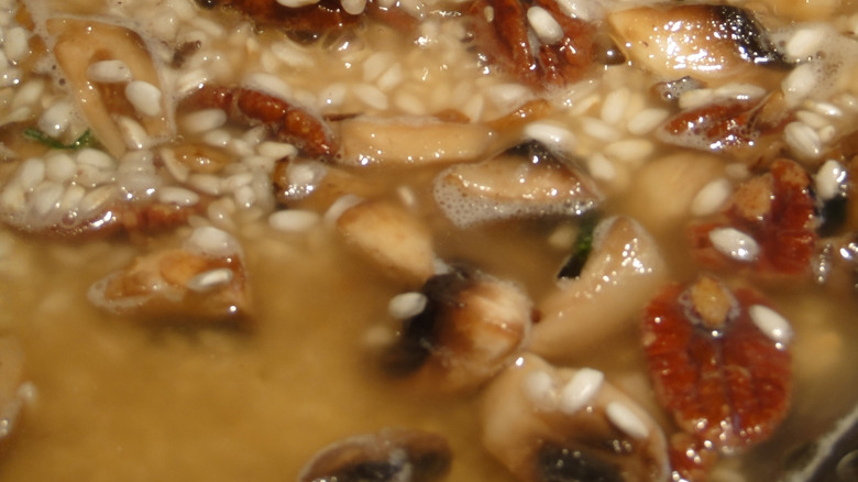 If you're not excited by the thought of consuming a bowl of rice with aromatics and hints of chicken, beef, or vegetable broth, don't worry, because there is plenty you can do to add oomph to your risotto. Possible add-ins include roasted shrimp, crumbled sausage, roast chicken, or seared scallops, all of which are added before the risotto is served (via The Kitchn). If your craving is for a vegetarian risotto, Gordon Ramsay offers up a risotto topped with mushrooms that have been cooked in olive oil, and where the rice has been toasted with olive oil, and to which wine has been added (via Hell's Kitchen Recipes).