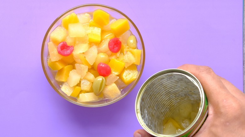 In the play and film "Steel Magnolias," the character Truvy shares her recipe for Cuppa Cuppa Cake: a cup of flour, a cup of sugar, and a cup of fruit cocktail with syrup, served with ice cream to "cut the sweetness" (via Houston Press). It's a funny joke, but unfortunately, canned fruit in syrup is a poor choice health-wise. As per Healthy Canning, canning fruit is more complex than stuffing fruit into a jar and sealing it. The preferred "hot pack" method retains the fruit's natural juices, while the cheaper and easier "raw pack" method employs sugar syrup and also compromises the natural taste of the fruit.
