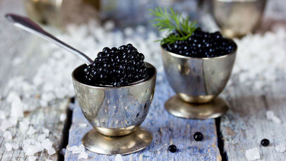 Whatever caviar you wind up buying, make certain you allow it to sit at room temperature for five to 10 minutes before you serve it. The Spruce Eats says that it is a myth you aren't supposed to serve caviar off of metal spoons, noting it is sold in metal containers. However, they also note that there is a stigma attached to using metal spoons and your guests might think the caviar is inferior if you do. Traditional caviar spoons are made out of mother of pearl, but you can also use plastic.