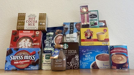 Selecting my field of 14 grocery store hot chocolate mixes first meant searching the online inventories of the five major grocery stores closest to me — Smith's, Trader Joe's, Sprouts, Whole Foods, and Albertsons — and selecting what I felt was the most diverse variety of products possible. I tasted them all in one evening, preparing each cup with a full serving of hot chocolate mix and near-boiling water, mixed with an electric frother. I took at least three sips of every cup.