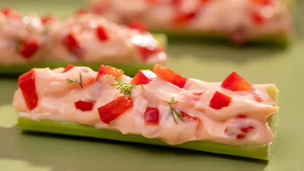 Those trends set the stage for the mid-century entertaining boom, when stuffed celery became a party tray fixture. It fit the era's love for tidy, colorful foods on crowded platters. With minimal prep required, it was a dependable option for cocktail hours and holiday buffets, served alongside briny olives, crispy pickles, and old-school favorites such as deviled eggs, cheese dreams, rumaki, shrimp cocktail, and pigs in blankets.