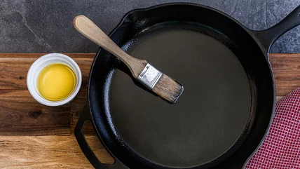 To properly season a cast iron skillet before its first use, you'll want to coat the inside and outside of the pan in a thin, even layer of cooking oil. Even if you bought yours pre-seasoned, it's a good idea to start this process again as it will begin building up that seasoning. Baked upside down in the oven for an hour or more at 400 degrees, this coating of oil begins to oxidize and transform into that slick hardened coating. This will suffice for immediate cooking, but the real magic happens with repeated use. The more you cook with the pan, the more effective the seasoning becomes. What's more, it will not leach harmful chemicals into your food. On the contrary, one of the things that arguably makes cast iron pans better than non-stick ones is that they can transfer iron to your food.