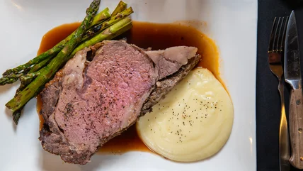 Prime rib is a succulent, melt-in-your-mouth cut of beef, carved into thick slices and paired with a savory broth known as au jus ("with sauce" in French) or creamy horseradish. Also known as a standing rib roast (although, there may be a difference between prime rib and rib roast), this slow-roasted meat became a traditional holiday dish and a popular menu item at supper clubs and steakhouses in the early-to-mid 20th century. Indeed, Lawry's The Prime Rib, an iconic, California-based upscale steakhouse helped popularize prime rib with its table-side service and perfectly seasoned slices of tender beef.