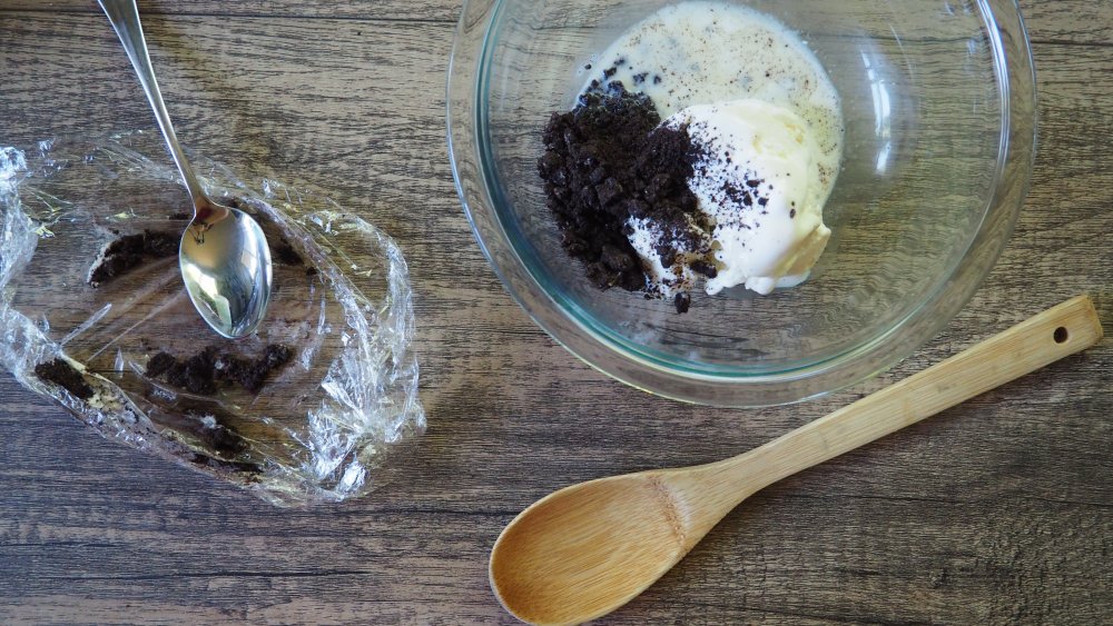 When you're ready to make your 3-ingredient copycat McDonald's Oreo McFlurry, start by crushing the Oreos. We found the easiest way to crush the cookies was to wrap them loosely with plastic wrap. Then, tap the package with a rolling pin to break the cookies into smaller pieces. We don't recommend rolling the rolling pin over the cookies, which will completely obliterate them. That's a great way to flavor the vanilla ice cream and it's the only way to enjoy the McFlurry through a straw. But, you'll miss out on enjoying cookie chunks — one of our favorite parts of the McFlurry eating experience — so we recommend only breaking down the cookies into large but bite-sized pieces.