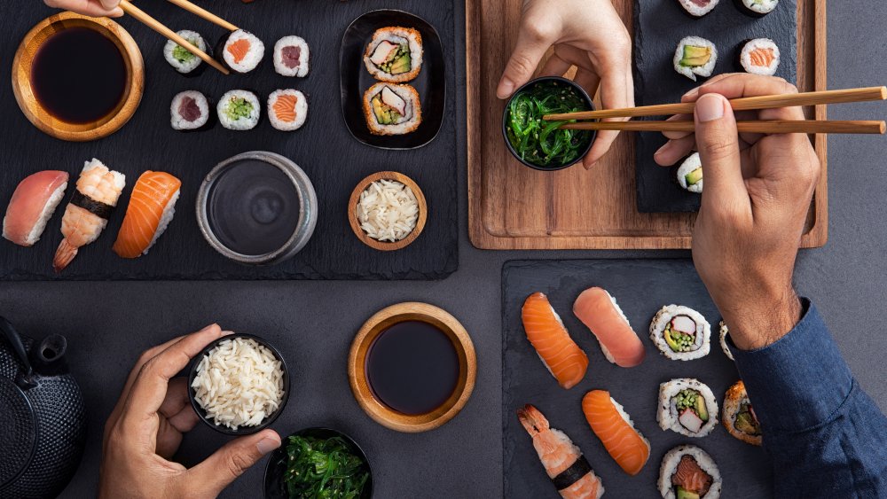 Just as you shouldn't salt your food before tasting it for fear of over-seasoning, you should be careful dunking your sushi in soy sauce. Both practices over-salt your food and are impolite if you don't taste the food first (via The Daily Meal). Not to mention, it can ruin the overall flavor profile of your food. Soy sauce will easily overpower the delicate flavors of your sushi roll if it is dredged in it. But, this mainly happens when you dip the rice in because it is more absorbent. So, always dip the fish or nori side into the soy sauce first (via Delish).