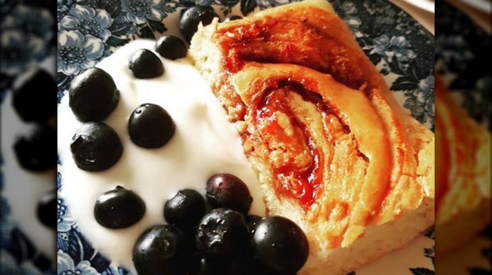 If you hear "sheet pan pancakes" and envision some thin, flat, boring piece of cake, topped with runny syrup, think again. Hussain's traybake pancakes are marbled with swirls of oozy peanut butter and jelly and they stand up tall, fluffy, and golden — even better-looking than traditional skillet-cooked pancakes, if you ask us. Hussain garnishes her sheet pan pancakes with icing and sugar (via BBC Food).