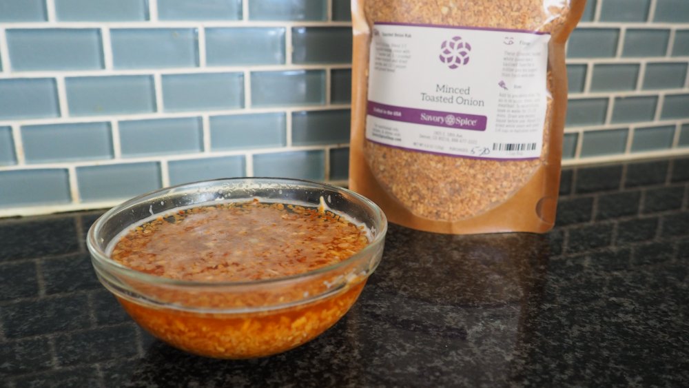 - Rehydrate the onions by mixing them with the water. Allow the mixture to sit for 5 to 10 minutes.
