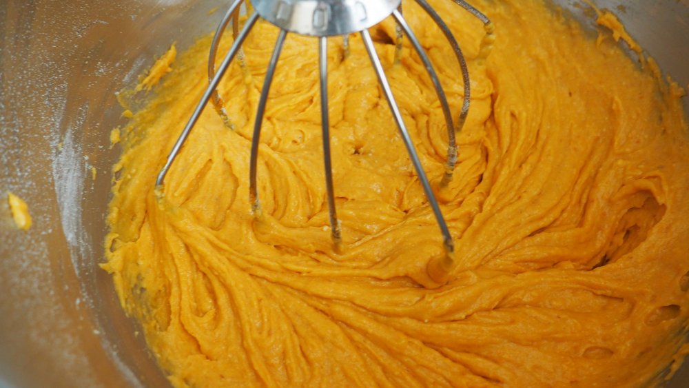 When you're ready to bake this dangerously easy 3-ingredient marshmallow pumpkin cake recipe, preheat the oven to 350 degrees Fahrenheit. Then, add the cake mix and pumpkin pie mix in the bowl of a stand mixer. Using the whisk attachment, whisk the mixture until it's light and fluffy. If you don't have a stand mixer, you can use an electric hand mixer or mix by hand using a standard whisk.