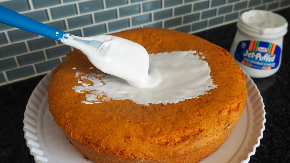 - Just before frosting, use a whisk to whip the marshmallow cream with 1 tablespoon of warm water to thin it to a spreadable consistency. Spread the marshmallow frosting over top of the cake, allowing some to drip down the sides. You'll have enough frosting to fully frost the sides, if you wish. If desired, toast the fluff with a kitchen blowtorch.