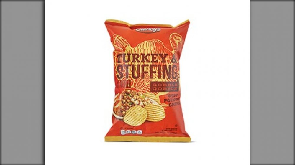 Making Thanksgiving dinner can come with an extra-large side of pressure, especially if you don't have years of experience cooking the meal under your belt. From dry turkey to gluey mashed potatoes to forgetting to bake the rolls, there's a lot that can go wrong — so it might be a good idea to have a backup plan should things take a turn for the worse. Aldi's new and strange Thanksgiving-flavored potato chips just might be the answer you're looking for (via Aisle of Shame).