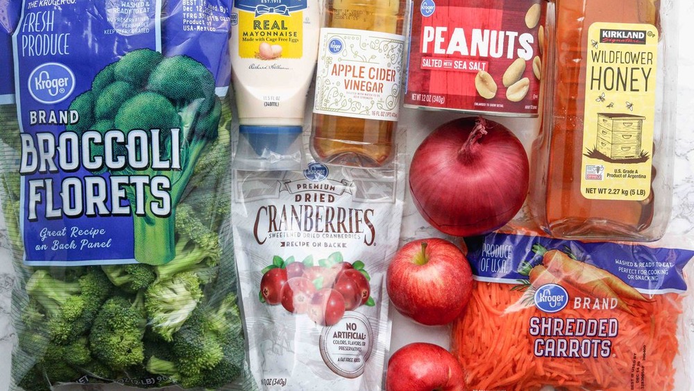 The ingredients for this simple broccoli salad are far from intimidating. You probably already have several of them in your kitchen right now, like broccoli, dried cranberries, apple, carrots, red onion, salted peanuts, mayo, apple cider vinegar, and honey. But here's an important note about your main ingredient: broccoli. "I would only use fresh broccoli so that the texture stays crisp and crunchy," Nedeff told us when we asked if frozen broccoli works here. Okay, got it! After all, who wants a soggy salad?