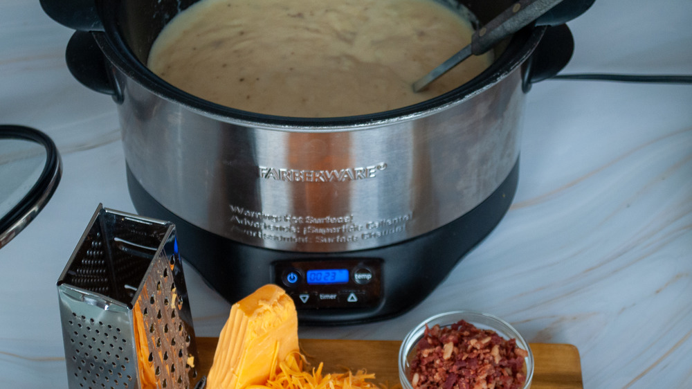 Here's the thing: As tasty as this simple-to-make slow cooker potato soup is, chef and food writer Laura Sampson of Little House Big Alaska says: "The toppings make this soup, so everyone can pick and choose their favorites. Use onions, chives, sour cream, shredded cheeses, leftover chopped veggies, leftover meats, croutons, and so on — you really can't go wrong."
