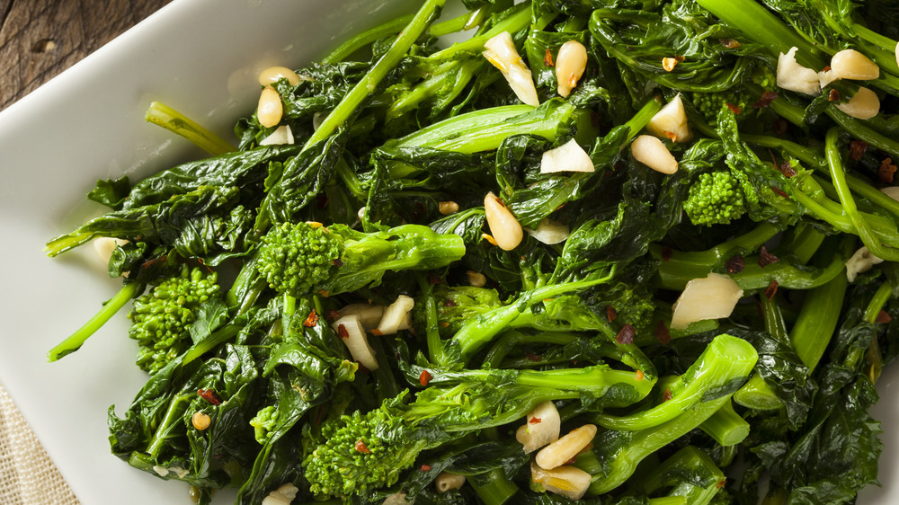 More closely related to turnips than actual broccoli according to The Kitchn (we know, we feel lied to, too,) broccoli rabe has long, thin stalks, floret-like buds, and a plethora of dark green leaves. As an added bonus, the entire vegetable is edible — stems, leaves, and all (via EatingWell). When it comes to taste, if you've ever had it, you probably know that broccoli rabe tastes nothing like your traditional broccoli; instead, it has a very distinct, bitter flavor.