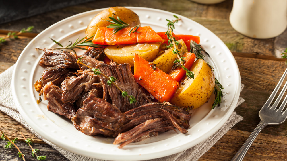 Pot roast really is that one-pot wonder in that you generally cook the entire meal – meat, potatoes, and carrots – in one pot. As she explains on her blog, pot roast uses tougher pieces of meat that require a long, slow cook to soften them up. The Pioneer Woman goes on to say that when it comes to pot roast, she prefers a chuck roast because of its marbling and "melt-in-your-mouth" quality when you cook it properly. But Drummond cautions, "You can't rush a pot roast; you'll be disappointed with the result if you try." Truth.