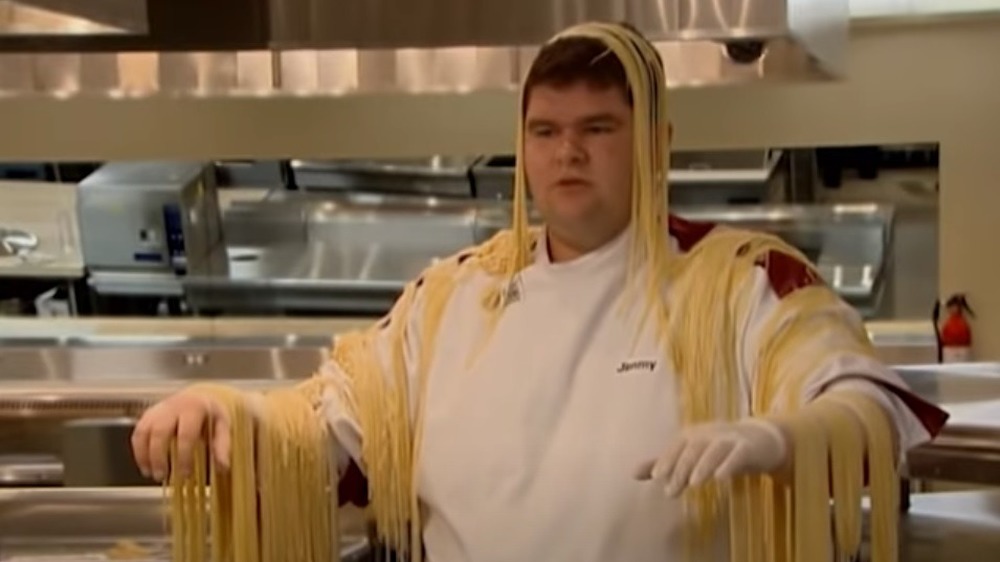 People who have never made their own pasta have no idea how much energy it takes to produce all those strands of starchy goodness. Home chefs make the easy choice of buying the premade dry stuff because tossing a handful of fettuccine into boiling water is a heck of a lot easier to prepare. But, in order to know just how talented the show's contestants were, one Hell's Kitchen challenge involved two teams making their own pasta as quickly as possible. And the way the pasta was presented had several contestants looking pretty unusual.