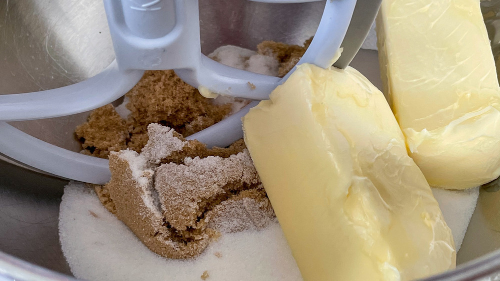 Your first step to make these oatmeal raisin cookies will be to preheat the oven to 350 degrees Fahrenheit. Do a bit more cookie prep by lining two baking sheets with Silpats or parchment paper, and set them aside. Now, turn your attention to mixing together your sugars and butter. Sampson advises ensuring these ingredients are well creamed, which will take about three minutes.