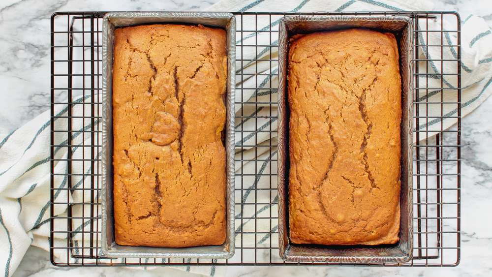 Freshly baked pumpkin bread is a comfort food treat that, for some reason, we only make when the leaves begin to change color in autumn. Why is that? Even if fall is the official pumpkin spice season, the truth is that canned pumpkin is on store shelves year-round. Pumpkin bread is easy to pull together, and you don't need to knead the dough or even use a mixer (via Sally's Baking Addiction). Need another reason to bake a batch today? According to Land O' Lakes, pumpkin bread freezes really well, so you can stash a loaf or two in your freezer to have ready to go in no time. When you're ready to eat it, it's important to know that there's a wrong way and a right way to thaw frozen pumpkin bread.