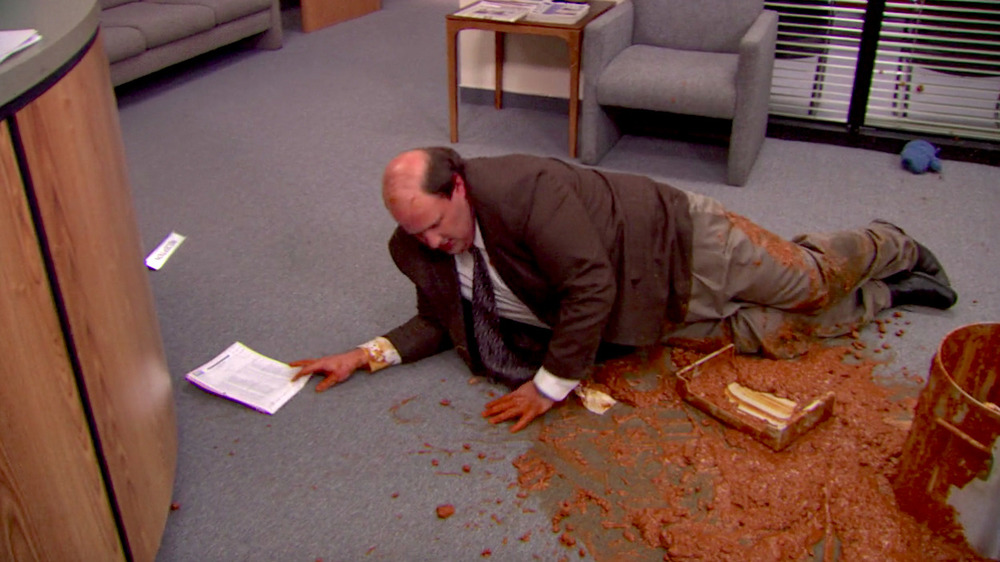 "When we were about to film that scene, the set decorators, the prop people, they came to me," says Baumgartner. "We had done a special little construction on that pot as well and how we were going to use it. It was a lot of discussion, but they [still] came to me kind of panicked before we shot it... Obviously, it created a mess." A mess that would be almost impossible to clean out of the carpet. "There was a huge cut-out carpet that would fit like a jigsaw puzzle into the front part of the office," says Baumgartner, "and they came to me and they said, 'We have three pieces of carpet. That is it. So we cannot do it any more than three [times].' They were very concerned about this. And I said, 'No problem. We're going to get it in one...' And we did."