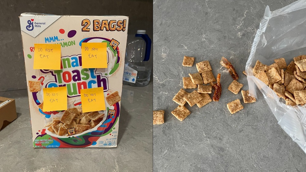 The difference seems to be the uncertainty of just who is responsible for this instance of shrimp contamination. According to Karp, one of the bags of cereal had "what appeared to be clear tape along the bottom, leading him to believe the boxes might have been tampered with." Meanwhile, the Cinnamon Toast Crunch Twitter account continues to deny all accountability for the incident and is "waiting for the consumer to send the package to investigate further," (via Twitter).
