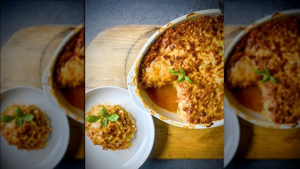 Spaghetti squash is like nature's little gift to parents. Really, it's pretty amazing — when baked, the insides really do scrape right out of the gourd in long, spaghetti-like strings, with a flavor that's more-or-less neutral when combined with other foods (especially strong, meaty and cheesy flavors). This means that when you serve up this cheesy, meaty, spaghetti squash lasagna casserole, your kids really might not clue into the fact that they're eating veggies in place of pasta ... and layering that veggie with onions, tomato sauce, and a variety of herbs.