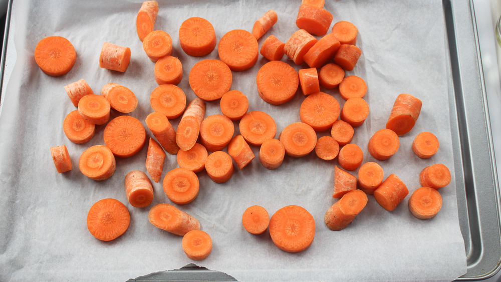 - Wash the carrots, slice them into 1-inch discs, and place them on a baking tray.