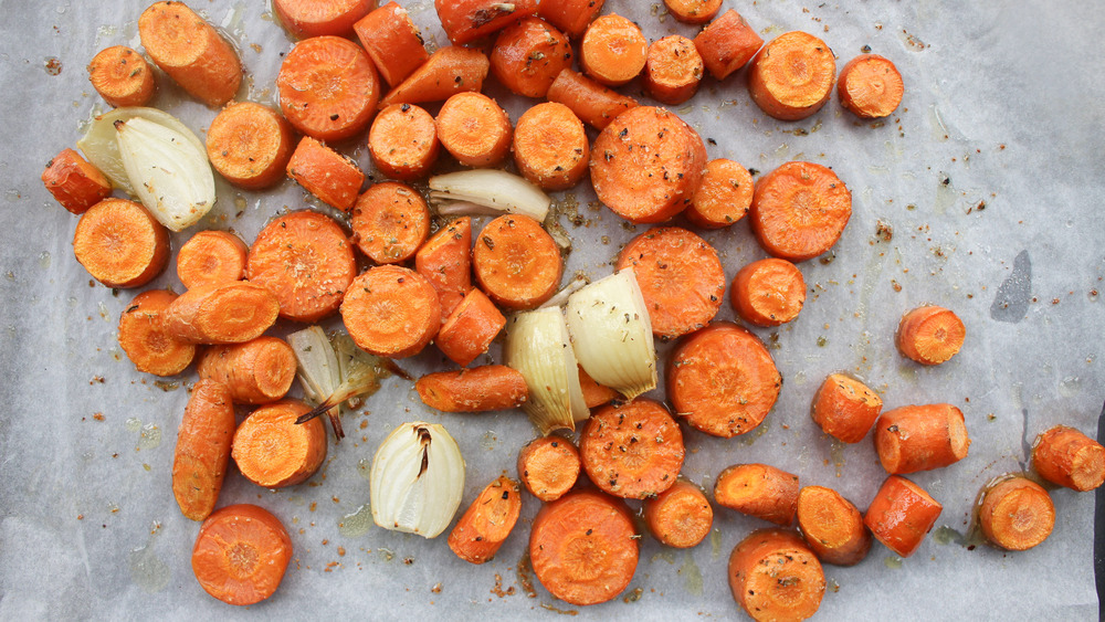Once your veggies have been thoroughly coated with the oil and spices, they're ready to be roasted. Put the sheet pan of onions and carrots in the oven, and bake them for 25 minutes.