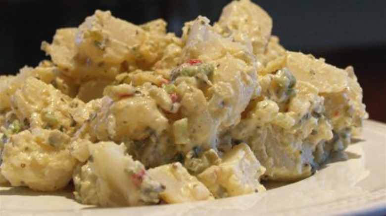 For each pound of potatoes you're using in your salad, you can add a boiled egg or two. Boil the potatoes and peel them if you like — or leave the skins on and label the salad as rustic. Cool the potatoes and dice them, then chop up the eggs as well. Mix the eggs and potatoes together along with any additional add-ins you like such as chopped celery, pickles, or onions, using mayo to bind everything together. Season with salt, pepper, and maybe some garlic powder, cayenne, or Tabasco sauce. You could even go hog-wild and throw in crumbled bacon for a salty crunch. Once you're done, stick the salad in the fridge for a few hours so all of the flavors can blend into one harmonious whole.